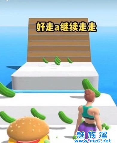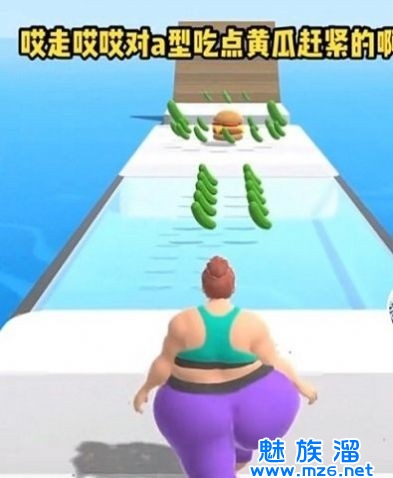 3、操控一个初始身材苗条的女性开启竞速跑酷挑战,赛道中分布着大量的黄瓜汉堡食物。
