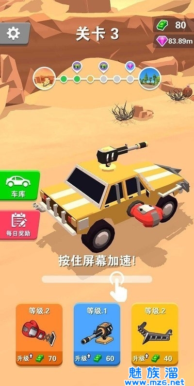 1、在赛车过程中,随意在三种武器之间切换以攻击敌人,升级时,您可以获得更多各种武器和车辆;