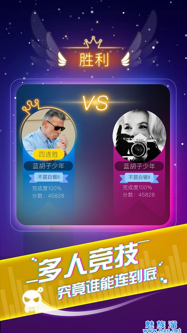 3.与千万音乐达人线上竞技切磋,PVP匹配赛玩不停,考验手速与音准,万人争歌王