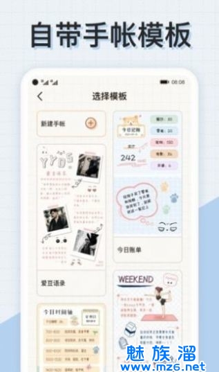 - 自带手帐模板和大量贴纸,方便上手