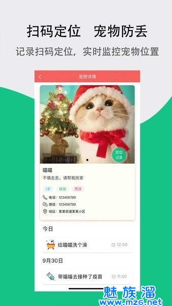 将二维码卡牌绑定宠物,若宠物不慎走失,可通过宠物详情页获取宠物的位置信息,增加宠物找回率。