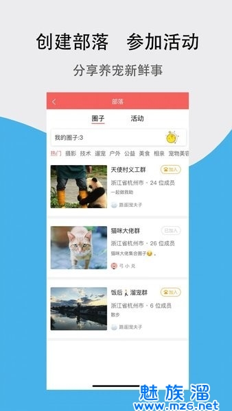在这里您可以创建/加入部落,发布/参加活动,获得一群有共同兴趣的宠友;