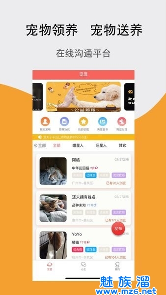 领养,送养在线匹配,您可以获得周边的送养信息,在线申请领养,将心仪宠物带回 家,您也可以发布送养信息,在线筛选优秀领养者,为爱物找到靠谱新家;