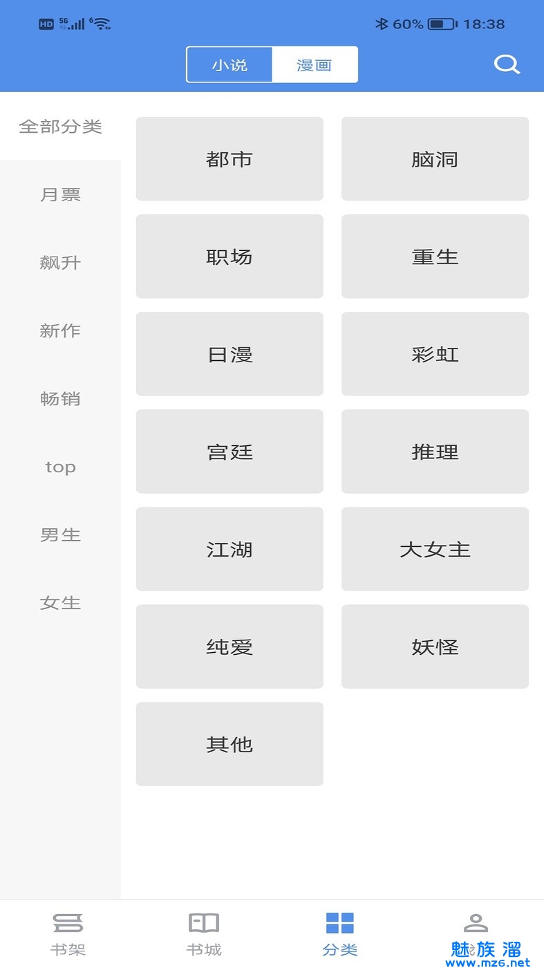 涵盖言情、穿越、玄幻、校园、古典武侠等各个类别;