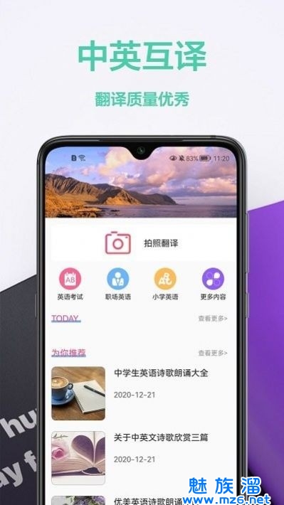 拍照英汉翻译,一款很方便的手机翻译类型的软件为大家推荐呢,精准的了解看看吧,为大家带来更好的翻译体验哦,内容识别比较迅速呢,自由去了解看看吧,拍照翻译的操作是很快速的哦,给大家更好的服务功能哦,来试试看吧。