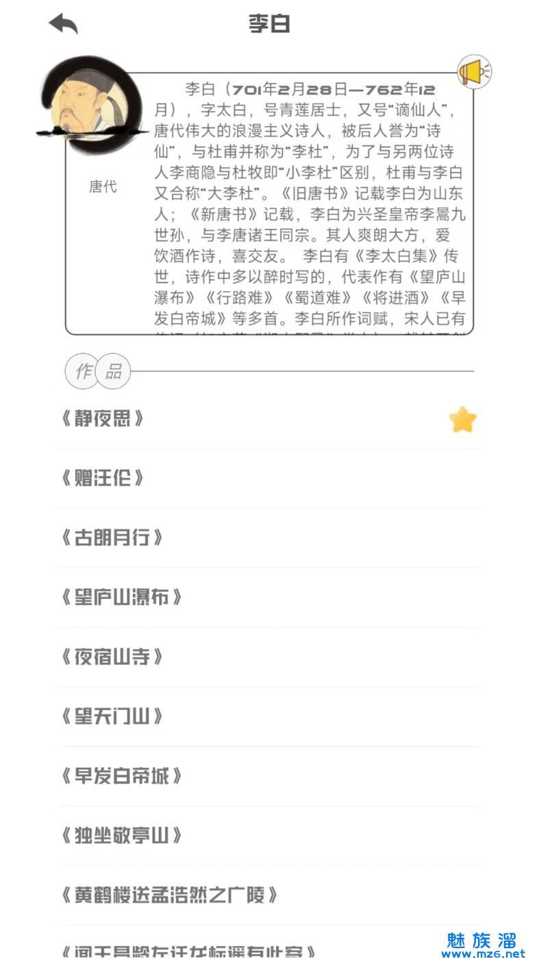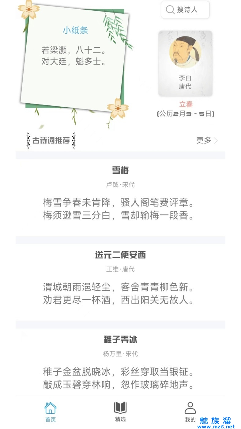 可实时查看古诗词、翻阅诗人资料、或者搜索相关诗作;