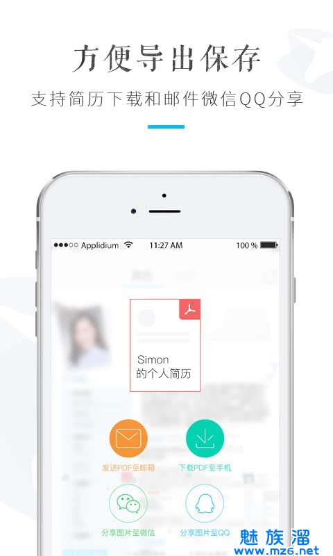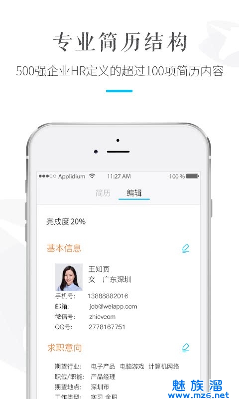 全球首个可以在手机上完成简历流畅编写的App,独有的所见即所得简历制作方式。移动端输入,随时编写导出,云端永久免费保存。