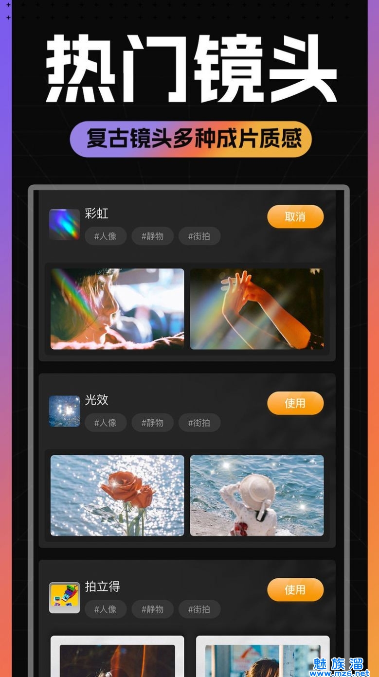 1、滤镜和特效很丰富的手机拍照工具,各位体验不同的拍摄吧;