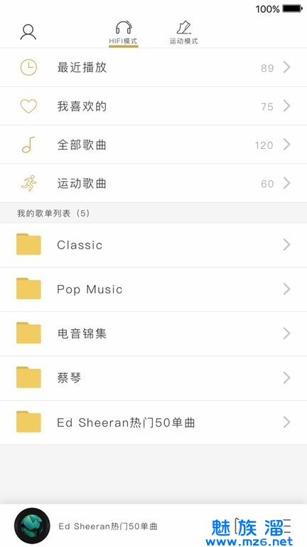 点击HIFI模式,查看最近播放、我喜欢的、全部歌曲等