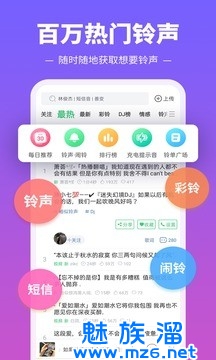 音乐、情感、语录、口白、Mc、电音、DJ、串烧舞曲、火热的抖音短点下就播放,一键完成设置,超简单呢。轻松设置铃声、彩铃(炫铃)、短信、闹铃,还可以给特别的联系人设置单独的来电铃声哦!