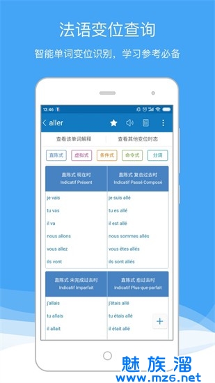 - 法语动词变位查询,提供18种时态的动词变位反查功能;