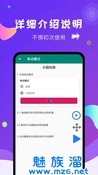 一款记录手势和点击操作轨迹的软件,这是无需root权限的自动点击器,它可以替代双手抢单、抢红包、抢购物券,是辅助你在手机屏幕界面点击的加速器。
