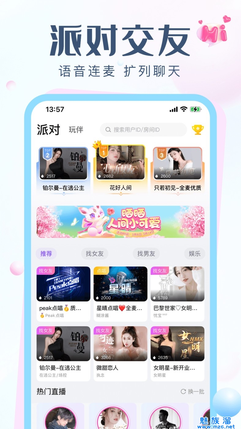 派对嗨玩,乐趣无穷,K歌扩列相亲组队等海量玩法,拥有线上交友圈