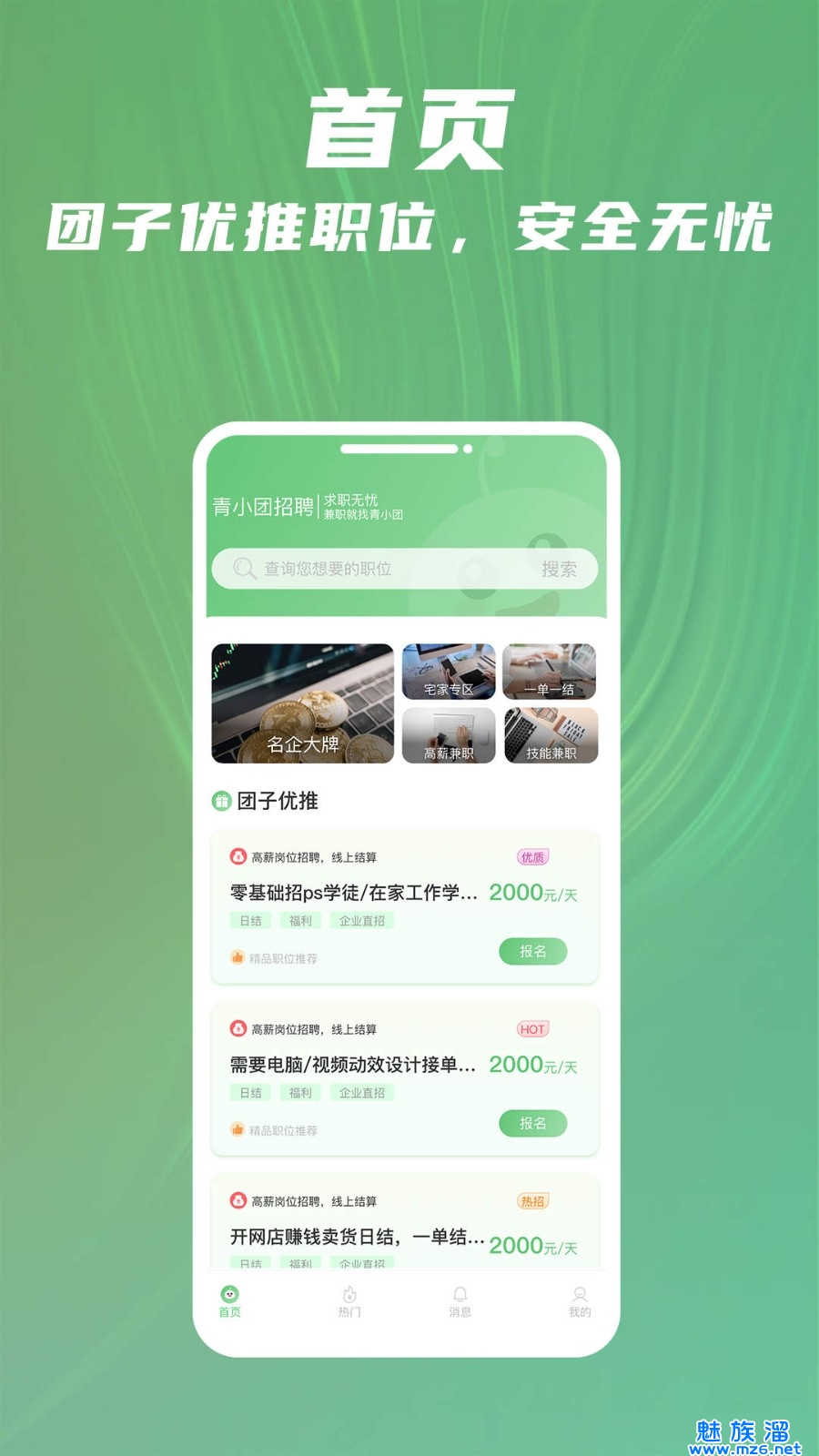 青小团招聘,想要找工作的小伙伴们可以来下载试试的呢,随时随地了解到最新的工作内容即可,找到适合自己的工作资源就在这里呢,智能推荐各种工作信息就在这里呢,给你推荐优质好工作,个性化的界面,可以直接上传自己的简历呢。