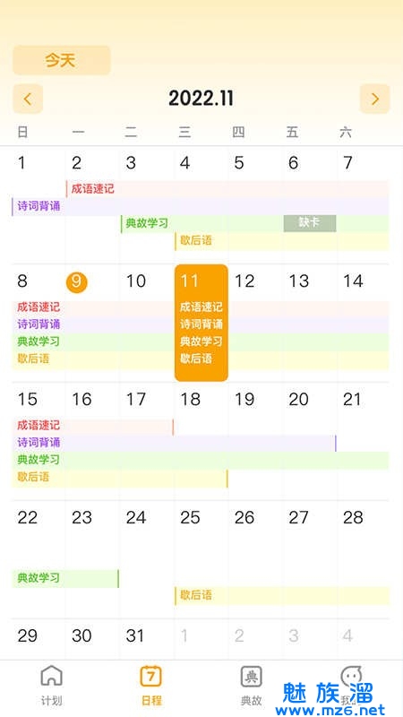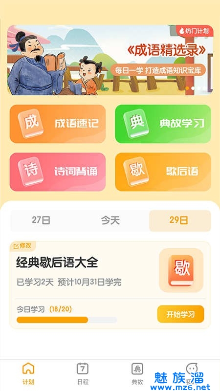 4、支持用户进行固定成语的收藏、标记成语熟练程度,并定制学习计划。