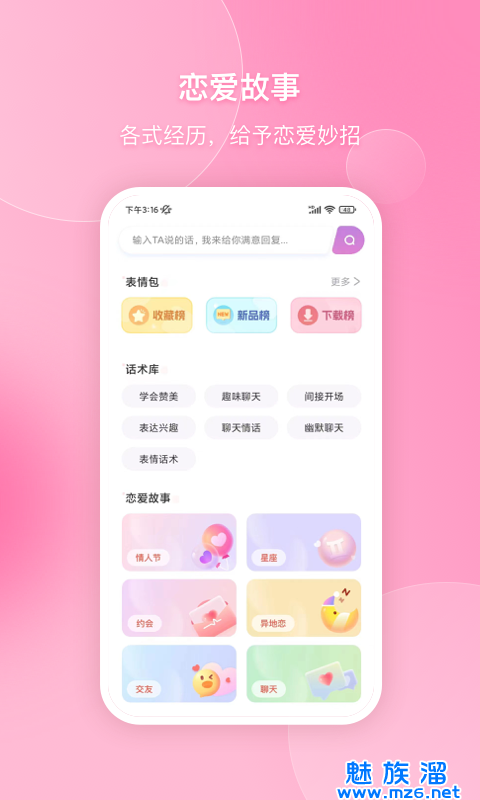 会聊聊天话术,这是一款有着好多好玩的话术的软件,是可以教你怎样去谈恋爱的,智能的话术资源,基本上都是真实的案例,好多的表情包,以及土味情话等,随时都可以来直接使用,快速来学习吧,提高你的情商,为你的恋爱助力。