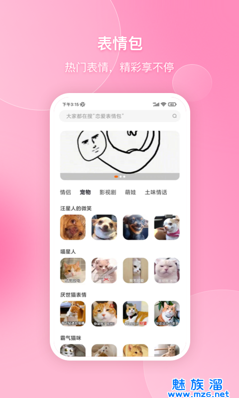 3、海量表情包:超多萌娃、搞怪、卡通等等表情包展示面应有尽有,为您恋爱助力;