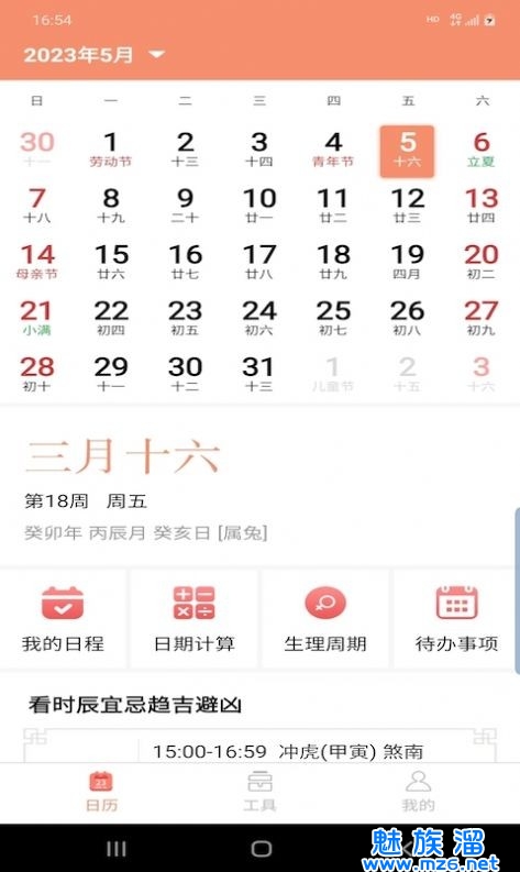 3、提供完整准确的农历功能,让用户快速了解农历日期和节气信息。它还包括十二生肖、五行和农历,供用户参考和查询。