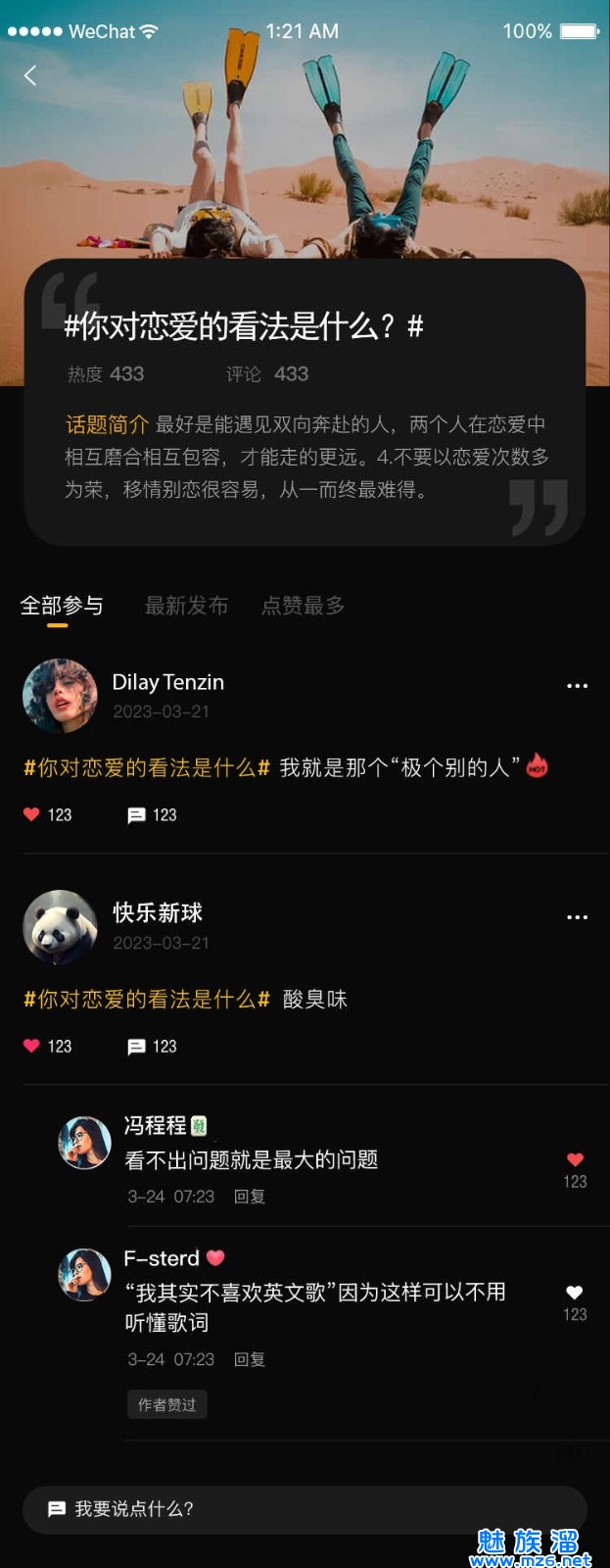 4、用户可以自由留言与点赞,自由参与有趣活动。