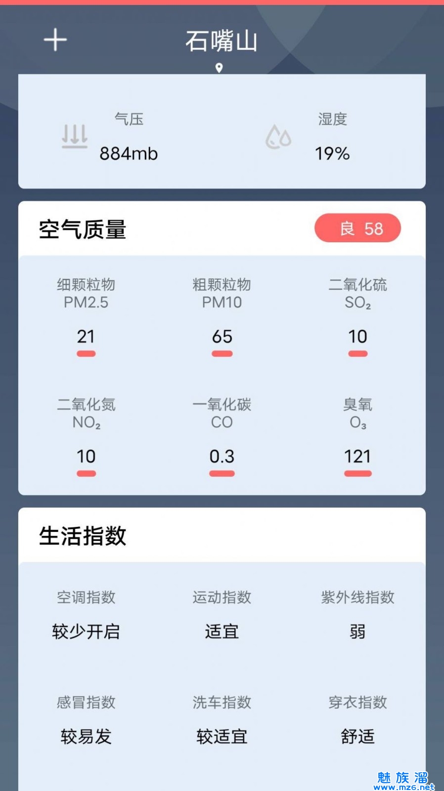 【天气实况】包括详情数据:体感温度,相对湿度,风向,风力,能见度,云量,降水量,气压。
