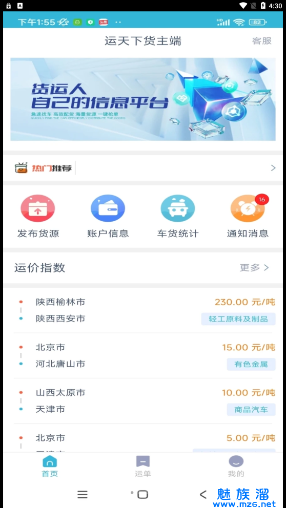 运天下货主端最新版下载,直接来免费试试看吧,最新的货物内容都可以为大家推荐的呢,最新的货物都可以直接给大家记录出来呢,在手机上寻找司机吧,快速的运输很方便的呢,广泛的服务内容可以去了解呢,来试试看。