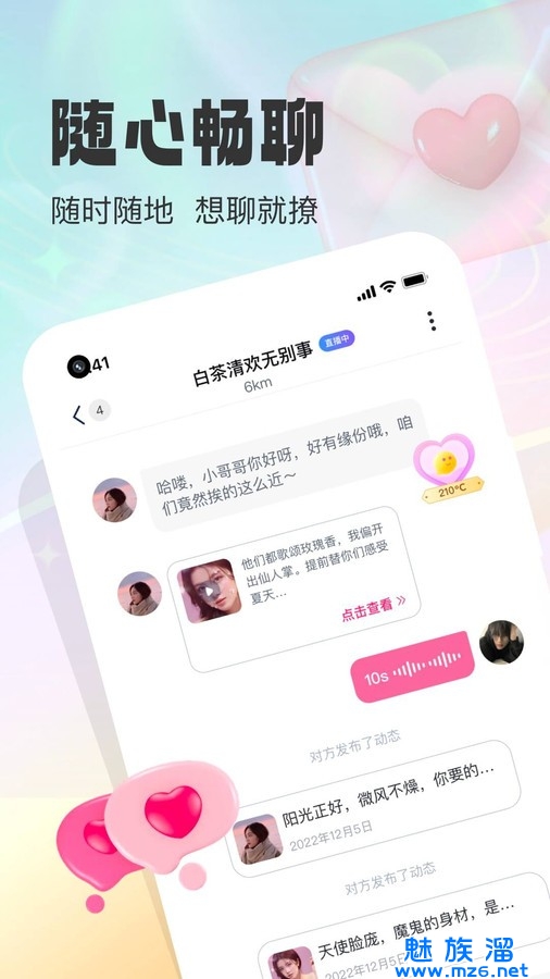系统智能匹配附近同城好友,自由选择心仪对象,线上交友蜜恋,线下约会见面;