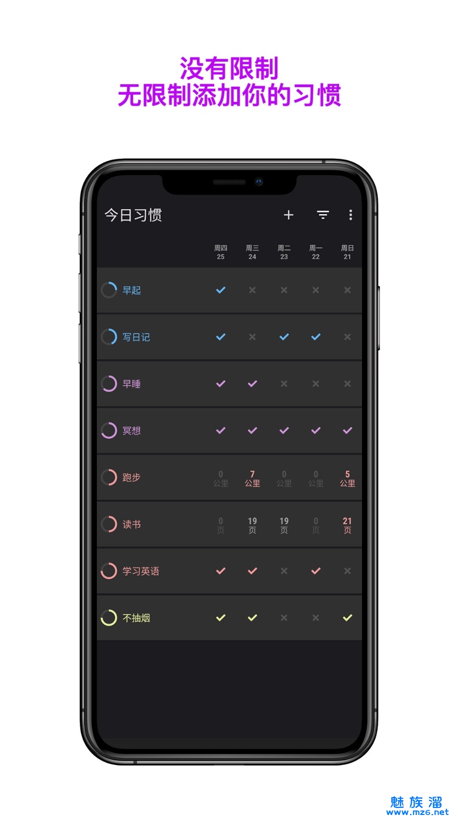 每天都有不同种类的习惯供你挑选,而且你也可以定制你要检查的东西。
