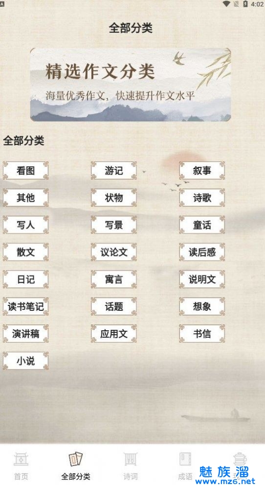 1、该APP的界面非常简洁明了,所有作文素材都按照类别和主题进行分类;