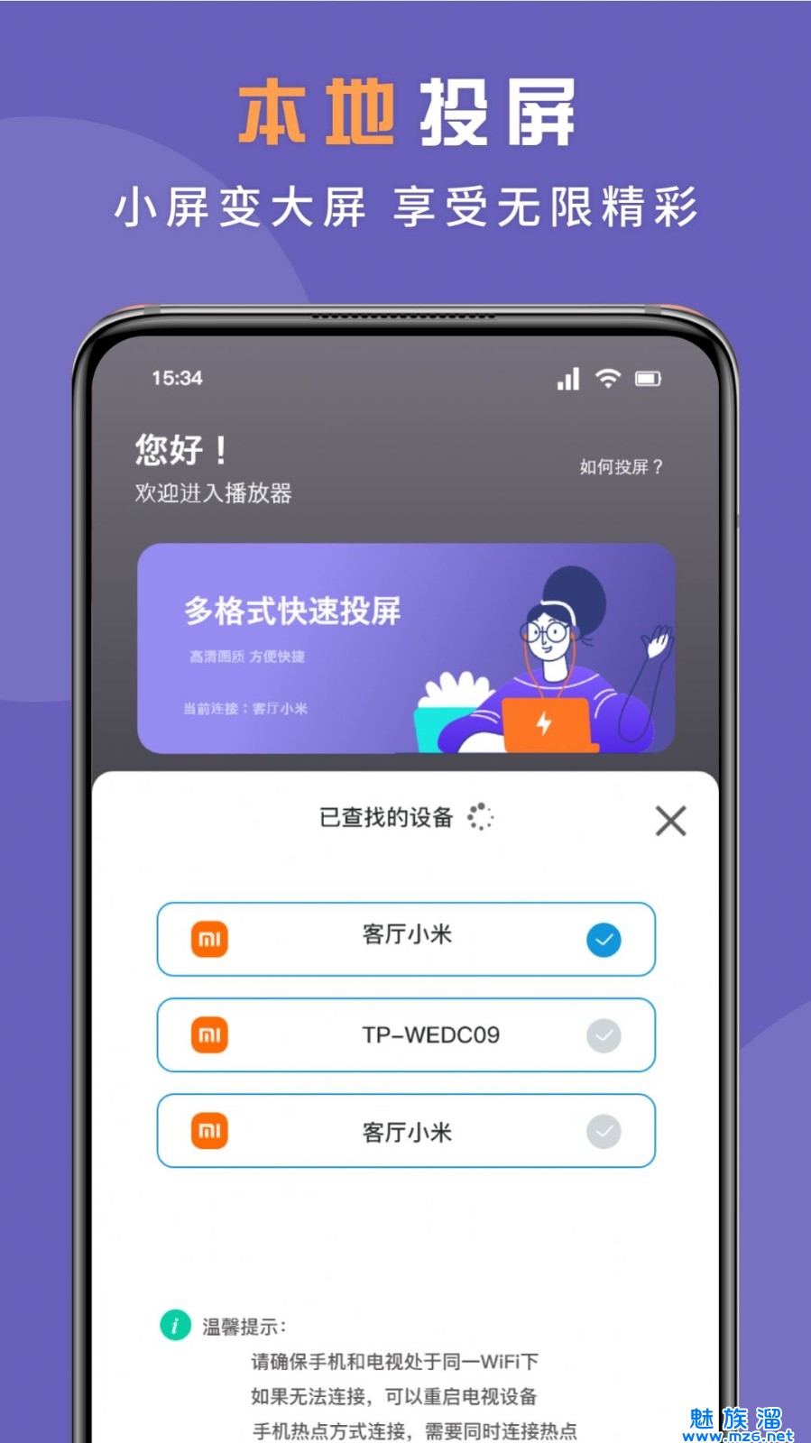 1、【多模式投屏】:支持多种投屏模式,如手机互动、APP应用共享、屏幕同步等,满足用户的不同投屏需求。