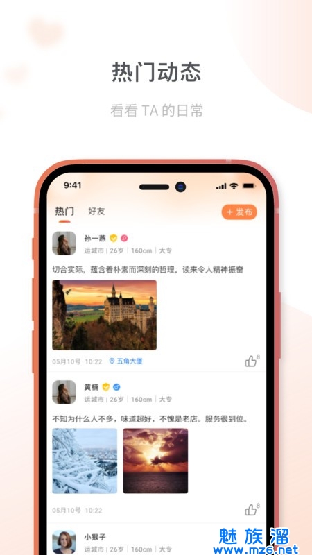 将社交元素与相亲结合,支持动态发布、点赞、评论等功能,让你更加了解你的对象。
