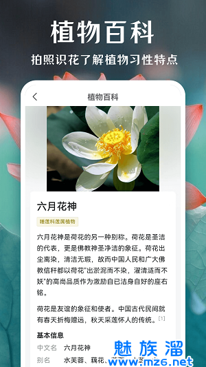 *丰富的植物百科知识:详细的植物分类、形态、节律、生长环境、生态习性、繁殖方式等内容,让你全面了解植物。