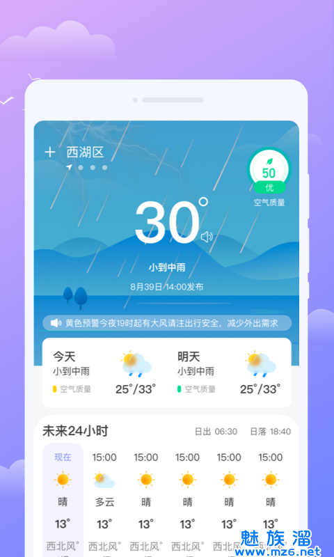 微观天气,是款超级不错的天气预报的软件,这里会是智能的推荐更多的天气,涵盖的城市也是比较的多的,降雨量,湿度,以及穿衣指南等都会有着详细的数据的,提供个性化主题,随时来更换哦,界面简单,随时来注意天气。