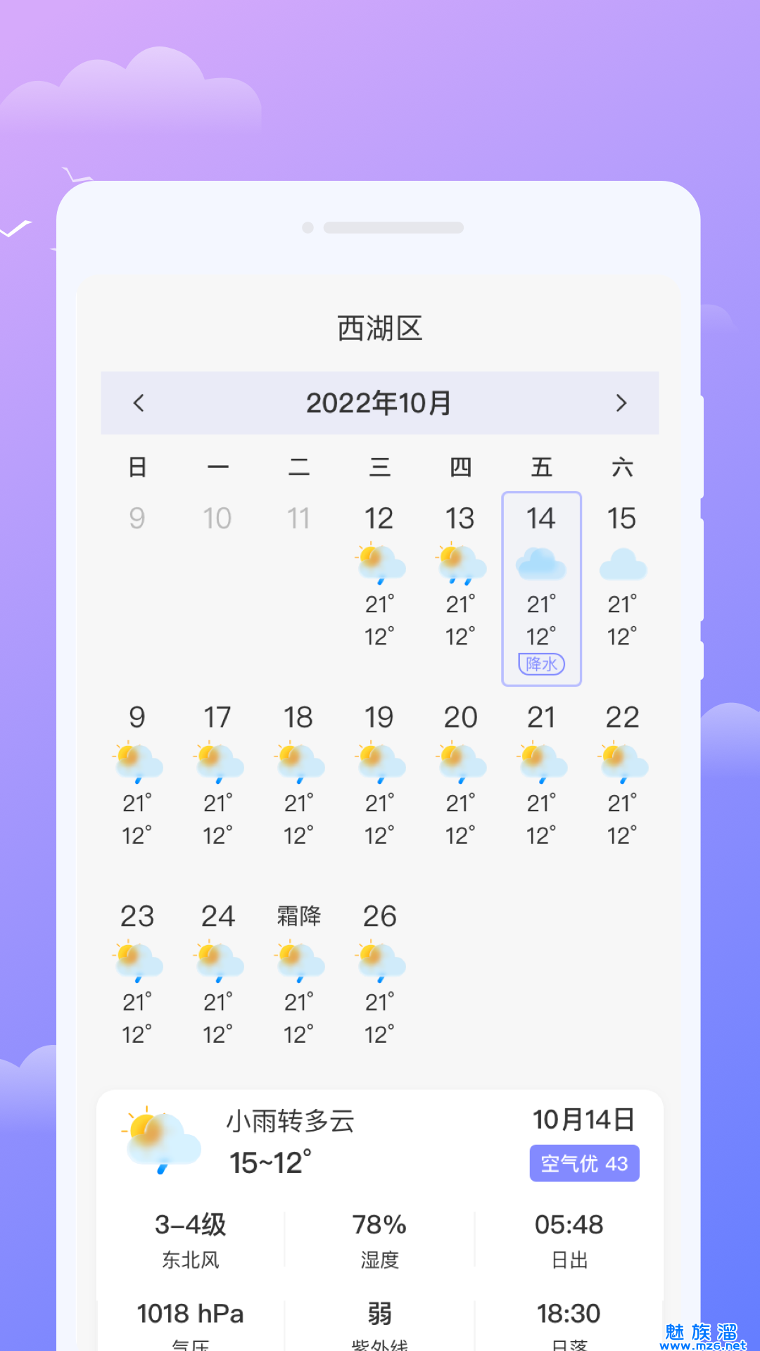 1、针对不同天气状况,提供不同的背景壁纸,增加用户体验;