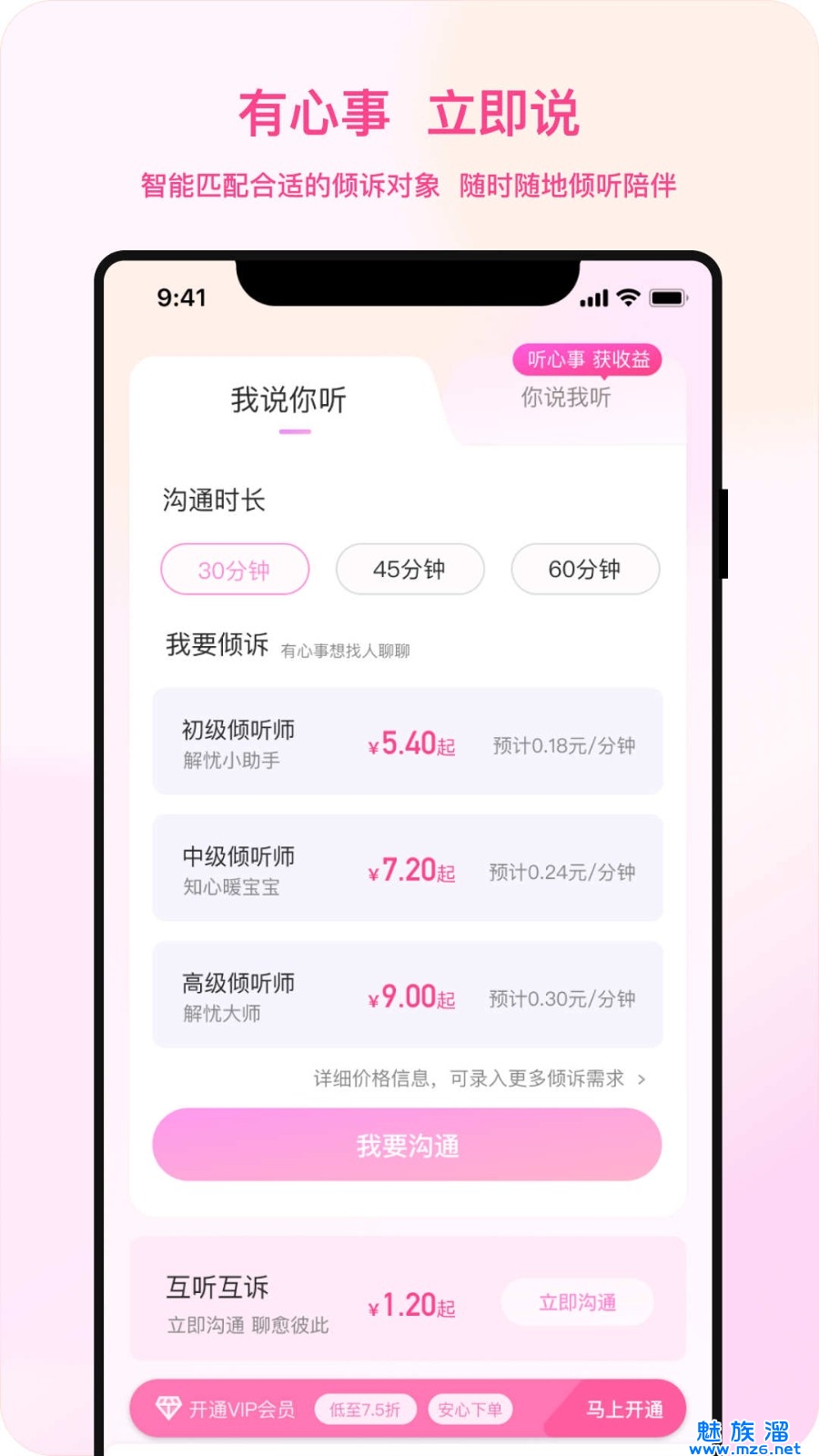 听昵,一款有着超级不错的心理倾诉的平台,软件支持多个角度去更好的倾诉,实时来更新语音,文字,等方式去倾诉,这里有着专业的心理咨询师,还有心理问答卷,看看自己是否心理有问题,还可以在这进行交友哦,和其他人一起来聊天。