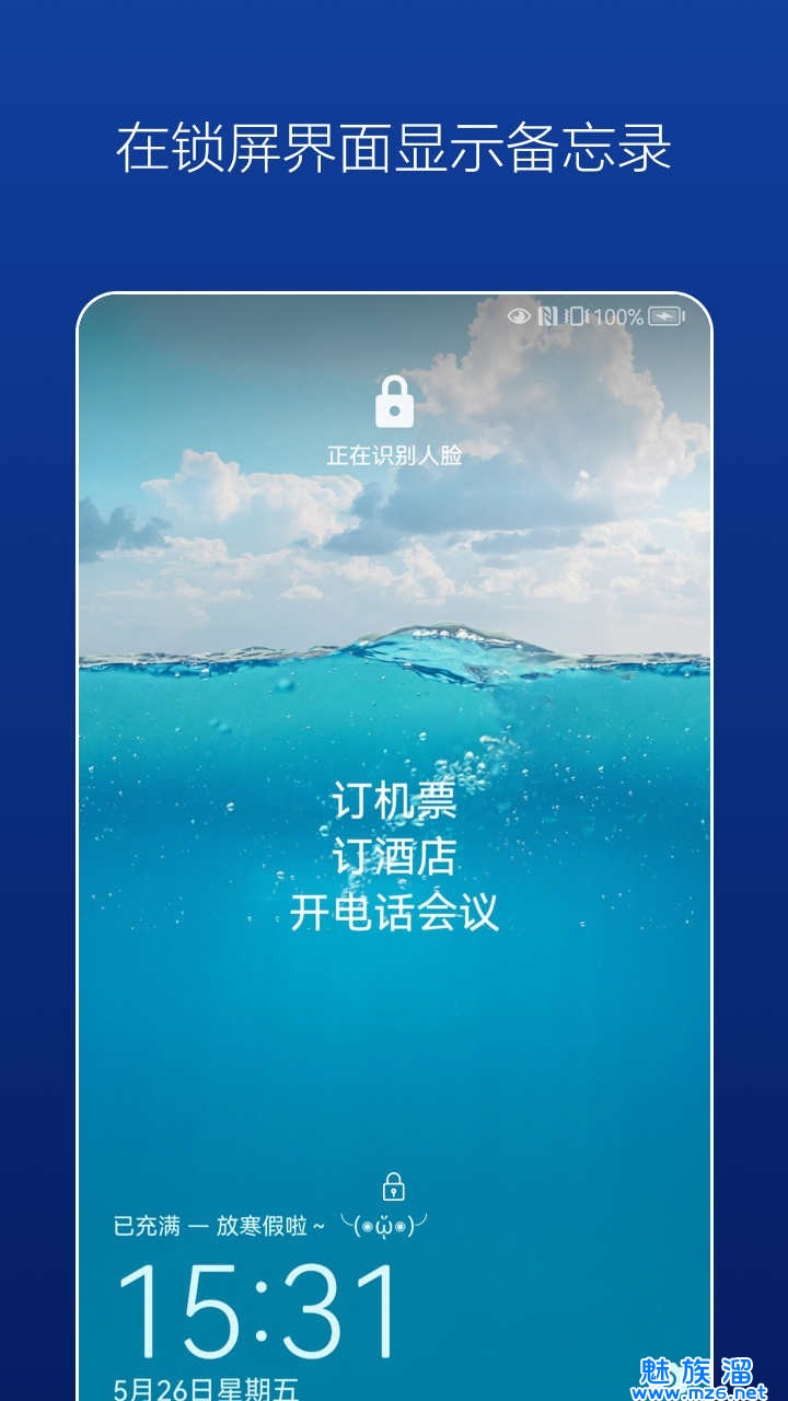 1、与手机锁屏界面完美结合,可以让备忘录一直显示在锁屏界面上,时刻提醒你重要事项。