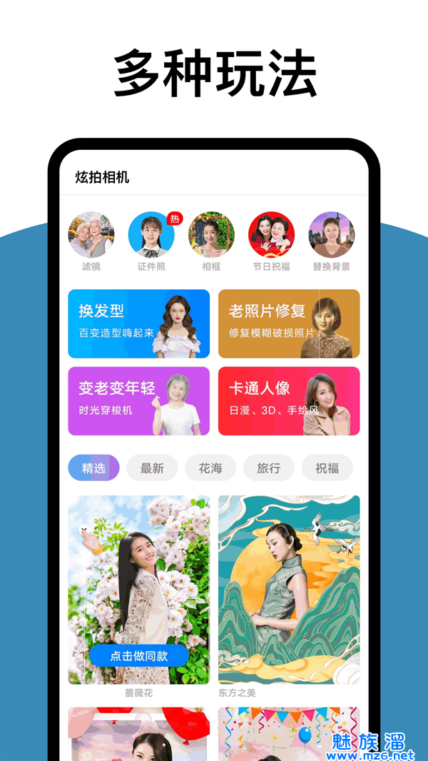 拓扑炫拍相机,一款多功能美颜相机拍照的平台,这里支持更多的照片的拍摄,好多的拍照的模式,可以选择不同的滤镜来拍照,软件是比较的精彩的,超多的素材,还可以添加水印,以及不同的模板免费使用,让你的照片充满艺术感,地啊你轻松拍摄大片。