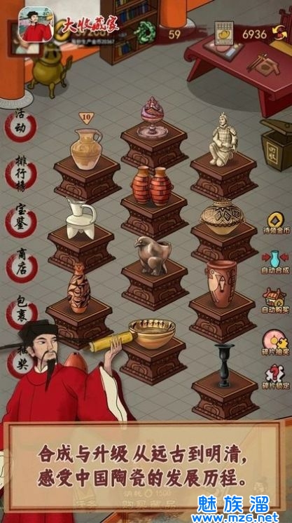 大收藏家是一款以买卖古董为主题的模拟经营合成类游戏,玩家在游戏当中将扮演一位大收藏家,买卖收集各式各样的古董藏品,收藏品包括了瓷器、玉器等,对于喜欢收集的玩家来说非常吸引人,每一件在游戏中展现的藏品都有详细的介绍,不仅让人了解它们的历史、文化意义,也增加了游戏的趣味性。