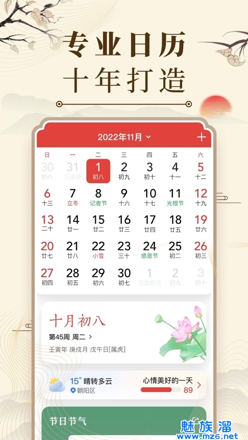 中华万年历最新版2023能够为用户带来便捷的日历查询体验,是一款符合中国人传统使用习惯的日历APP,为大家提供了详细的万年历信息,传统的老黄历功能这里也有,让大家随时轻松的查询,以便于更好的做计划安排,提供了丰富的查询功能,还有天气预报功能可以使用,更好安排日程。