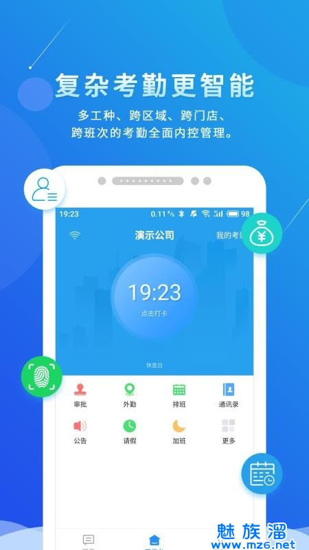快速打卡不排队:支持二维码、wifi打卡、gps打卡,快速免排队。
