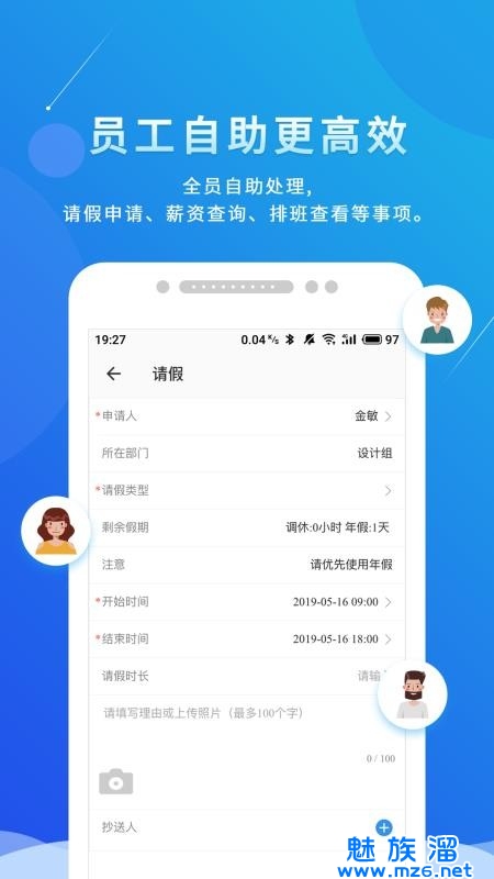 各类申请一键搞定:加班、请假、出差等复杂流程申请,手机轻松搞定;