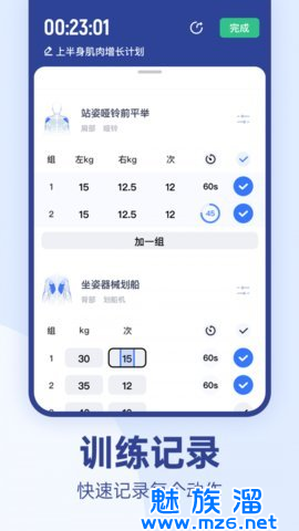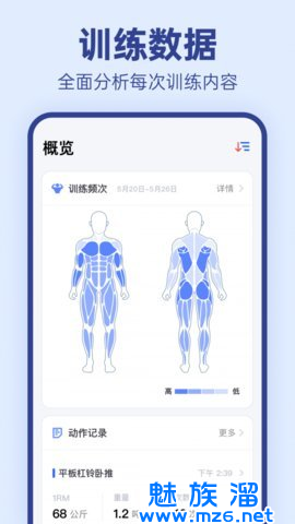 1、这个应用程序提供了简洁直观的训练数据概览,可以精确追踪训练重量、组数、次数、间歇、单次极限重量等信息。