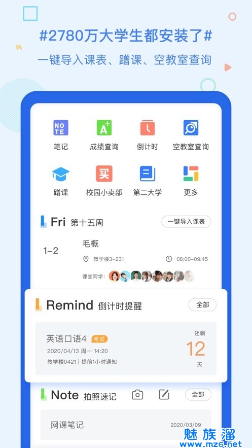 超级课程表通过和教务系统对接,直接将你的课表导进手机。课程名、上课地点、上课时间、授课教师等信息一目了然,还可以认识同课堂的同学。更有成绩查询、考试倒计时等实用工具,让你的学习生活更便捷!