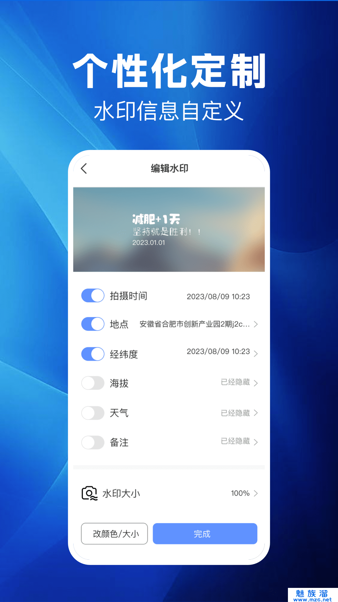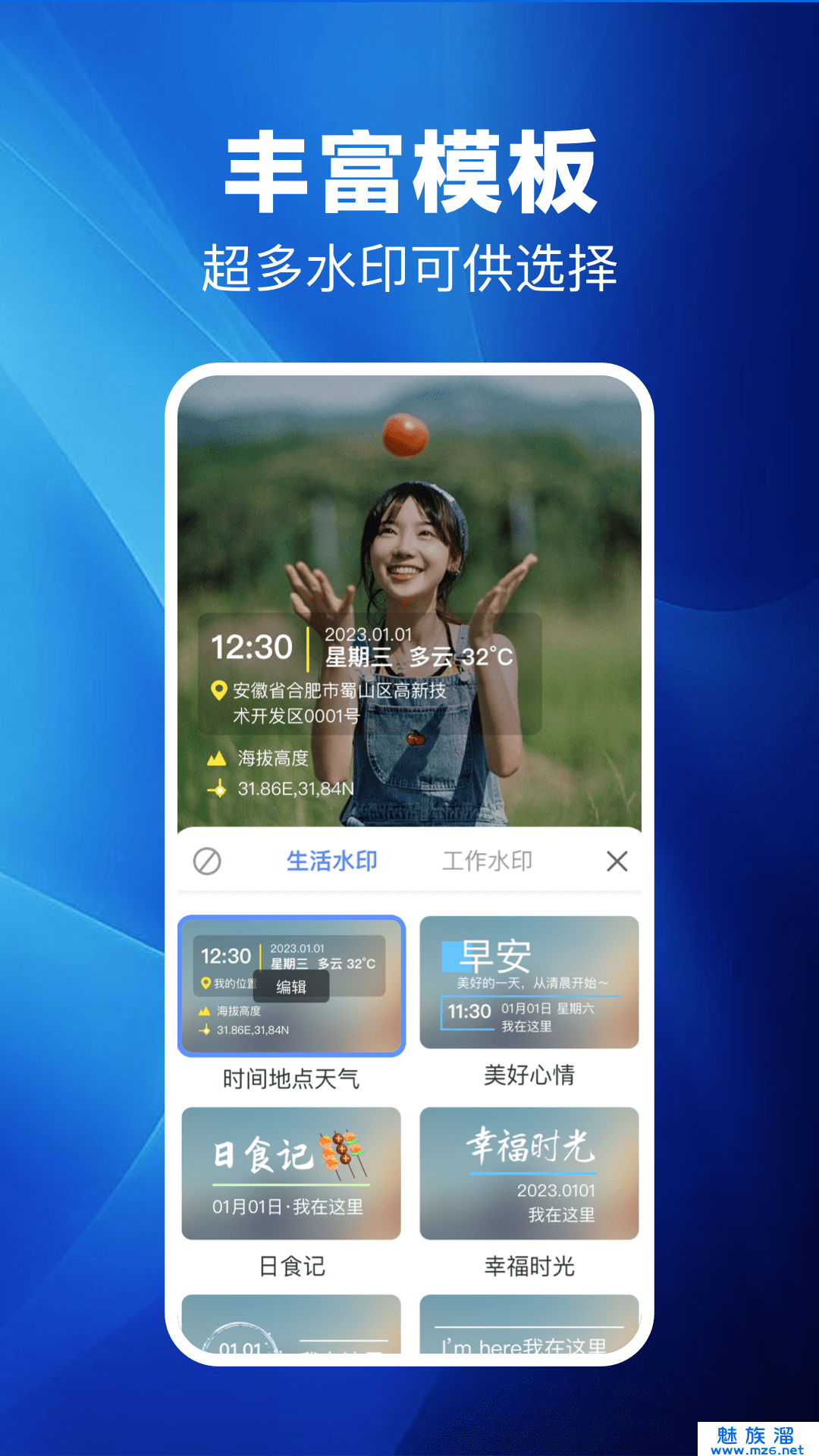 1、时间地点水印,智能信息实时显示,一键获取当前时间地点作为水印;