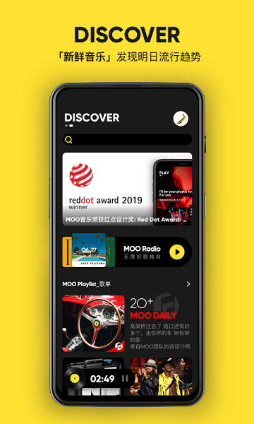 音乐发现:由MOO编辑部和音乐人发起,每天都有新的歌单、专辑和新歌推荐。