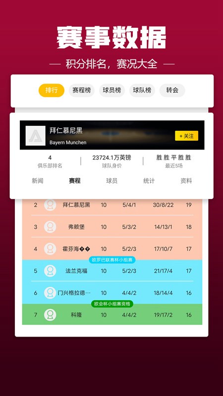 球队数据一览无余,关注赛事订制闹铃提醒,不再错过热点体坛赛事。