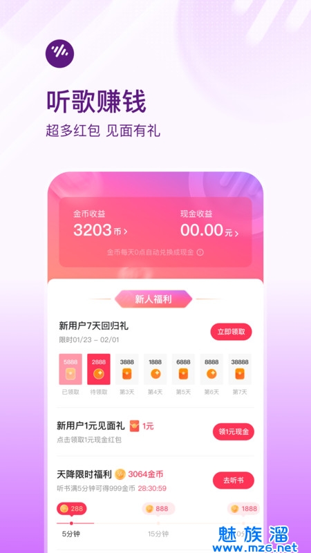 2、支持听歌赚钱,超多红包,见面有礼。