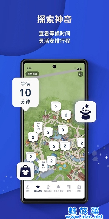 4.查看等待时间及演出安排:快速查看景点及娱乐演出预计等待时间以及当前正在发放的快速通行证的返回景点时间.查看花车巡游及娱乐演出时间.