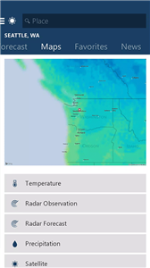 还提供交互式地图功能,您可以深入查看详细的温度、雷达观测、雷达预测、降水情况、云图和卫星地图。
