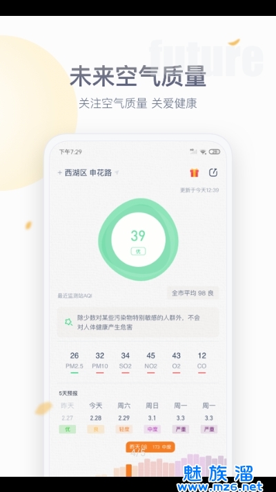 直观查阅实时空气质量和7日预报,PM2.5及其他污染物数值清晰展示