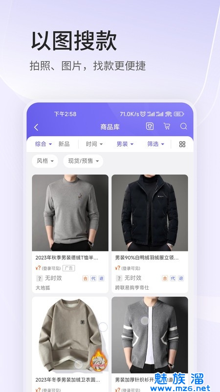 跨联易购app(com.zj.jx.klyg)是一款很不错的服装批发购物软件,在这款软件中汇集了大量不同类型不同款式的服装批发产品,各种最新上线的服装衣物、热销产品、时尚造型衣物等资源全面覆盖,在线批发采购更便捷。在跨联易购官网版中还能通过搜图的方式拿货,有需要的用户快试试吧。